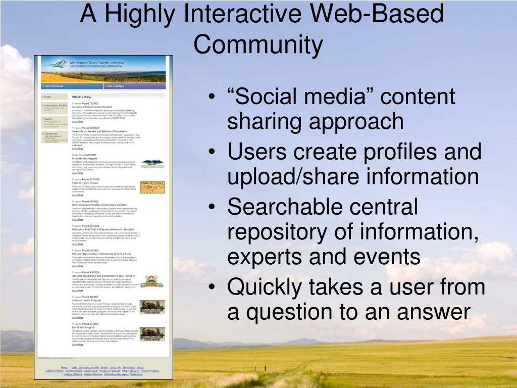 RHI: A Health and Wellness Community and Resource Network RHI – making it happen • A highly interactive web-based community/ “social network”www.montanaruralhealthinitiative.org • Regular communications via a listserv and e-newsletter • Webinars and educational programs designed to improve the capacity of rural Montana health & wellness programs