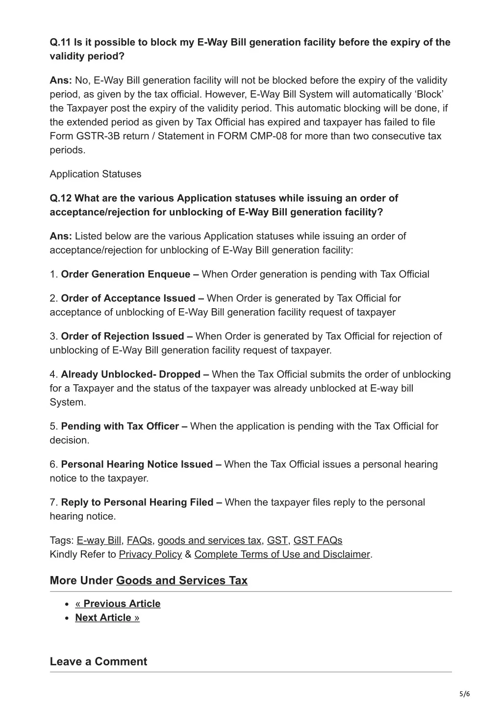 Q.11 Is it possible to block my E-Way Bill generation facility before the expiry of the validity period? Ans: No, E-Way Bill generation facility will not be blocked before the expiry of the validity period, as given by the tax official. However, E-Way Bill System will automatically ‘Block’ the Taxpayer post the expiry of the validity period. This automatic blocking will be done, if the extended period as given by Tax Official has expired and taxpayer has failed to file Form GSTR-3B return / Statement in FORM CMP-08 for more than two consecutive tax periods. Application Statuses Q.12 What are the various Application statuses while issuing an order of acceptance/rejection for unblocking of E-Way Bill generation facility? Ans: Listed below are the various Application statuses while issuing an order of acceptance/rejection for unblocking of E-Way Bill generation facility: 1. Order Generation Enqueue – When Order generation is pending with Tax Official 2. Order of Acceptance Issued – When Order is generated by Tax Official for acceptance of unblocking of E-Way Bill generation facility request of taxpayer 3. Order of Rejection Issued – When Order is generated by Tax Official for rejection of unblocking of E-Way Bill generation facility request of taxpayer. 4. Already Unblocked- Dropped – When the Tax Official submits the order of unblocking for a Taxpayer and the status of the taxpayer was already unblocked at E-way bill System. 5. Pending with Tax Officer – When the application is pending with the Tax Official for decision. 6. Personal Hearing Notice Issued – When the Tax Official issues a personal hearing notice to the taxpayer. 7. Reply to Personal Hearing Filed – When the taxpayer files reply to the personal hearing notice. Tags: E-way Bill, FAQs, goods and services tax, GST, GST FAQs Kindly Refer to Privacy Policy & Complete Terms of Use and Disclaimer. More Under Goods and Services Tax « Previous Article Next Article » Leave a Comment 5/6