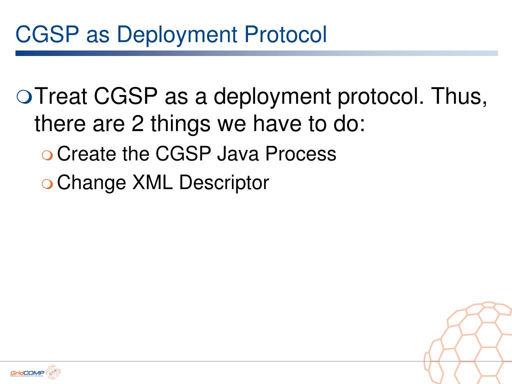 CGSP as Deployment Protocol • Treat CGSP as a deployment protocol. Thus, there are 2 things we have to do: • Create the CGSP Java Process • Change XML Descriptor