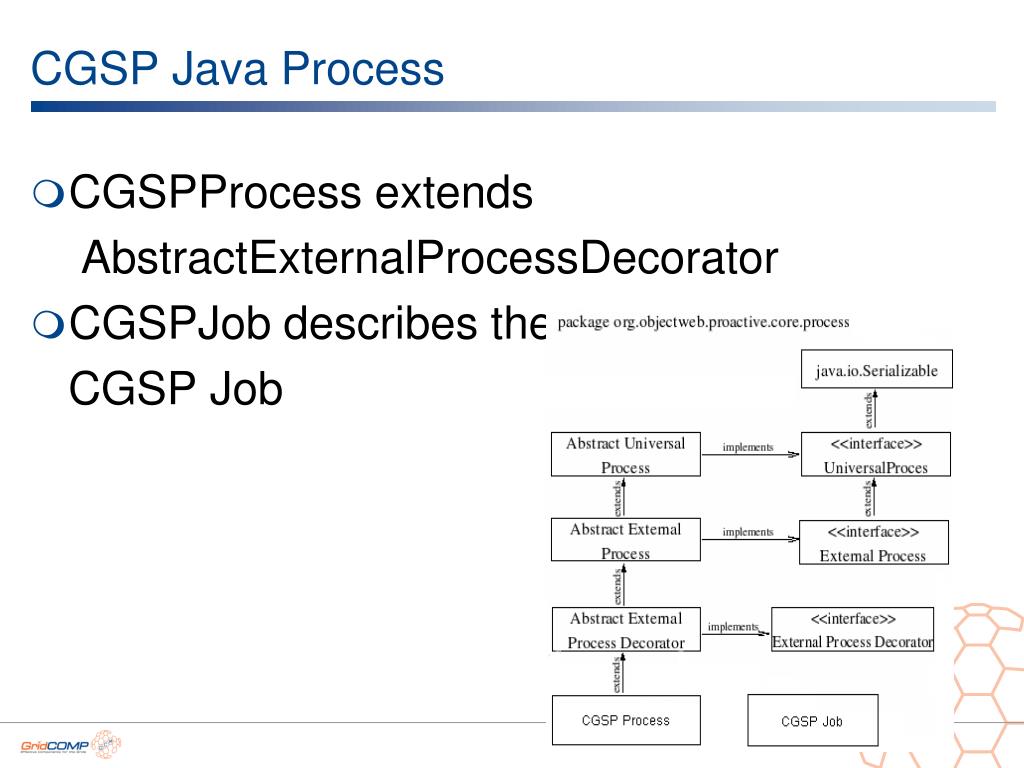 CGSP Java Process • CGSPProcess extends AbstractExternalProcessDecorator • CGSPJob describes the CGSP Job