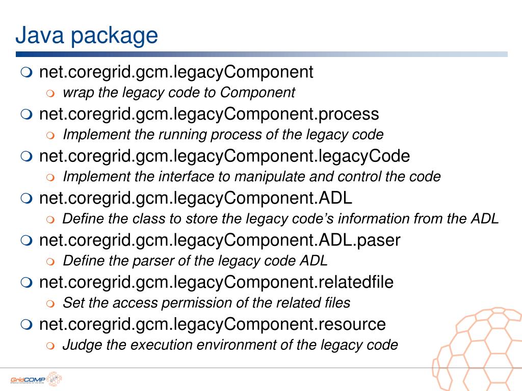 Java package • net.coregrid.gcm.legacyComponent • wrap the legacy code to Component • net.coregrid.gcm.legacyComponent.process • Implement the running process of the legacy code • net.coregrid.gcm.legacyComponent.legacyCode • Implement the interface to manipulate and control the code • net.coregrid.gcm.legacyComponent.ADL • Define the class to store the legacy code’s information from the ADL • net.coregrid.gcm.legacyComponent.ADL.paser • Define the parser of the legacy code ADL • net.coregrid.gcm.legacyComponent.relatedfile • Set the access permission of the related files • net.coregrid.gcm.legacyComponent.resource • Judge the execution environment of the legacy code