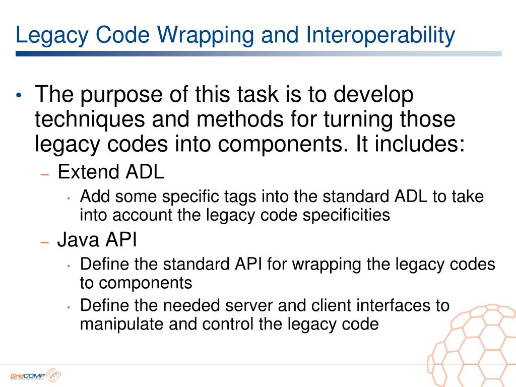 Legacy Code Wrapping and Interoperability • The purpose of this task is to develop techniques and methods for turning those legacy codes into components. It includes: • Extend ADL • Add some specific tags into the standard ADL to take into account the legacy code specificities • Java API • Define the standard API for wrapping the legacy codes to components • Define the needed server and client interfaces to manipulate and control the legacy code