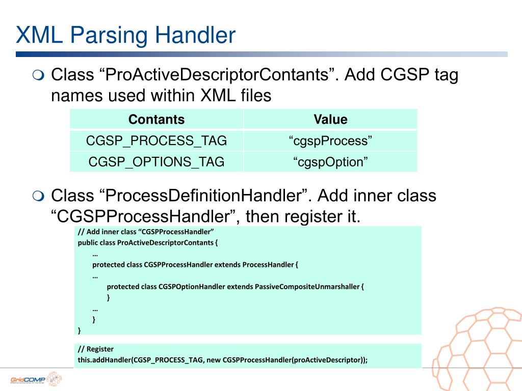 XML Parsing Handler • Class “ProActiveDescriptorContants”. Add CGSP tag names used within XML files • Class “ProcessDefinitionHandler”. Add inner class “CGSPProcessHandler”, then register it.
