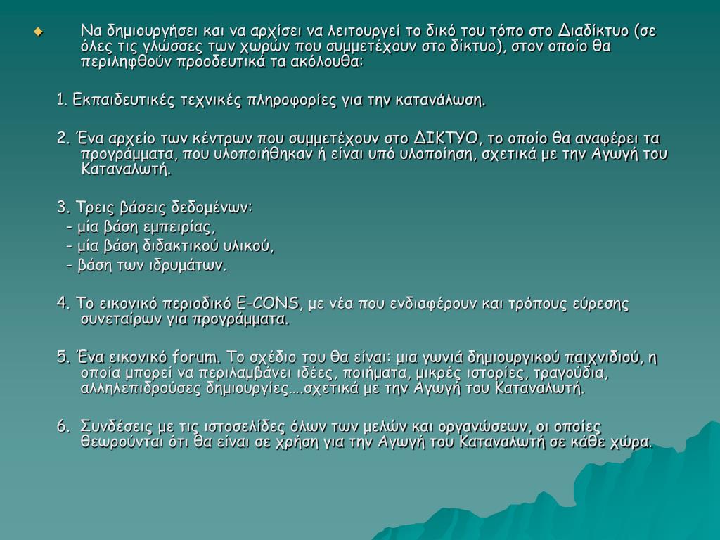 Να δημιουργήσει και να αρχίσει να λειτουργεί το δικό του τόπο στο Διαδίκτυο (σε όλες τις γλώσσες των χωρών που συμμετέχουν στο δίκτυο), στον οποίο θα περιληφθούν προοδευτικά τα ακόλουθα: 1. Εκπαιδευτικές τεχνικές πληροφορίες για την κατανάλωση. 2. Ένα αρχείο των κέντρων που συμμετέχουν στο ΔΙΚΤΥΟ, το οποίο θα αναφέρει τα προγράμματα, που υλοποιήθηκαν ή είναι υπό υλοποίηση, σχετικά με την Αγωγή του Καταναλωτή. 3. Τρεις βάσεις δεδομένων: - μία βάση εμπειρίας, - μία βάση διδακτικού υλικού, - βάση των ιδρυμάτων. 4. Το εικονικό περιοδικό E-CONS, με νέα που ενδιαφέρουν και τρόπους εύρεσης συνεταίρων για προγράμματα. 5. Έναεικονικό forum. Το σχέδιο του θα είναι: μια γωνιά δημιουργικού παιχνιδιού, η οποία μπορεί να περιλαμβάνει ιδέες, ποιήματα, μικρές ιστορίες, τραγούδια, αλληλεπιδρούσες δημιουργίες….σχετικά με την Αγωγή του Καταναλωτή. 6. Συνδέσεις με τις ιστοσελίδες όλων των μελών και οργανώσεων, οι οποίες θεωρούνται ότι θα είναι σε χρήση για την Αγωγή του Καταναλωτή σε κάθε χώρα.