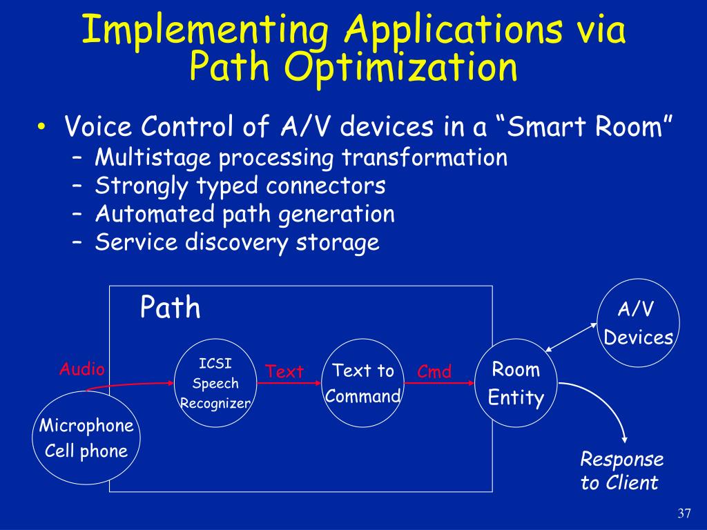 Implementing Applications via Path Optimization • Voice Control of A/V devices in a “Smart Room” • Multistage processing transformation • Strongly typed connectors • Automated path generation • Service discovery storage A/V Devices Path ICSI Speech Recognizer Text to Command Room Entity Audio Text Cmd Microphone Cell phone Response to Client