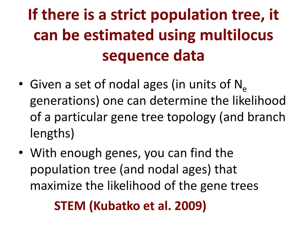 If there is a strict population tree, it can be estimated using multilocus sequence data • Given a set of nodal ages (in units of Ne generations) one can determine the likelihood of a particular gene tree topology (and branch lengths) • With enough genes, you can find the population tree (and nodal ages) that maximize the likelihood of the gene trees STEM (Kubatko et al. 2009)
