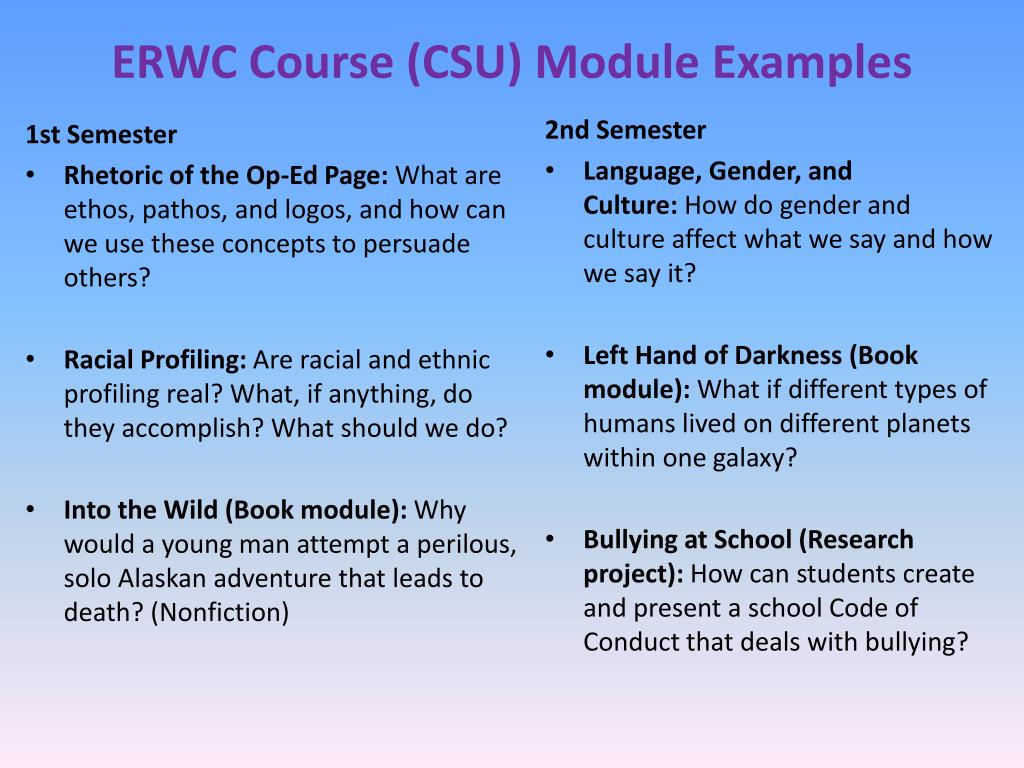 ERWC Course (CSU) Module Examples 1st Semester • Rhetoric of the Op-Ed Page: What are ethos, pathos, and logos, and how can we use these concepts to persuade others? • Racial Profiling: Are racial and ethnic profiling real? What, if anything, do they accomplish? What should we do? • Into the Wild (Book module): Why would a young man attempt a perilous, solo Alaskan adventure that leads to death? (Nonfiction) 2nd Semester • Language, Gender, and Culture: How do gender and culture affect what we say and how we say it? • Left Hand of Darkness (Book module): What if different types of humans lived on different planets within one galaxy? • Bullying at School (Research project): How can students create and present a school Code of Conduct that deals with bullying?