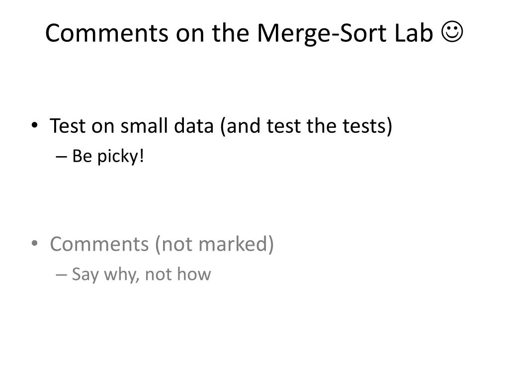 Comments on the Merge-Sort Lab • Test on small data (and test the tests) • Be picky! • Comments (not marked) • Say why, not how