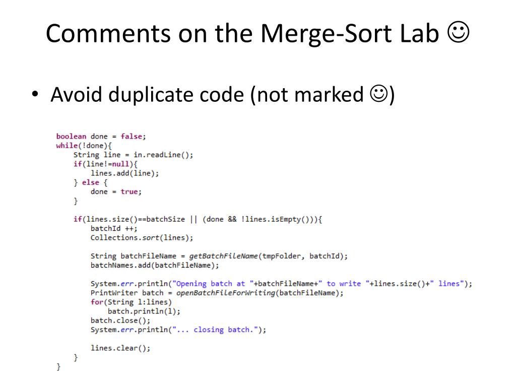 Comments on the Merge-Sort Lab • Avoid duplicate code (not marked )