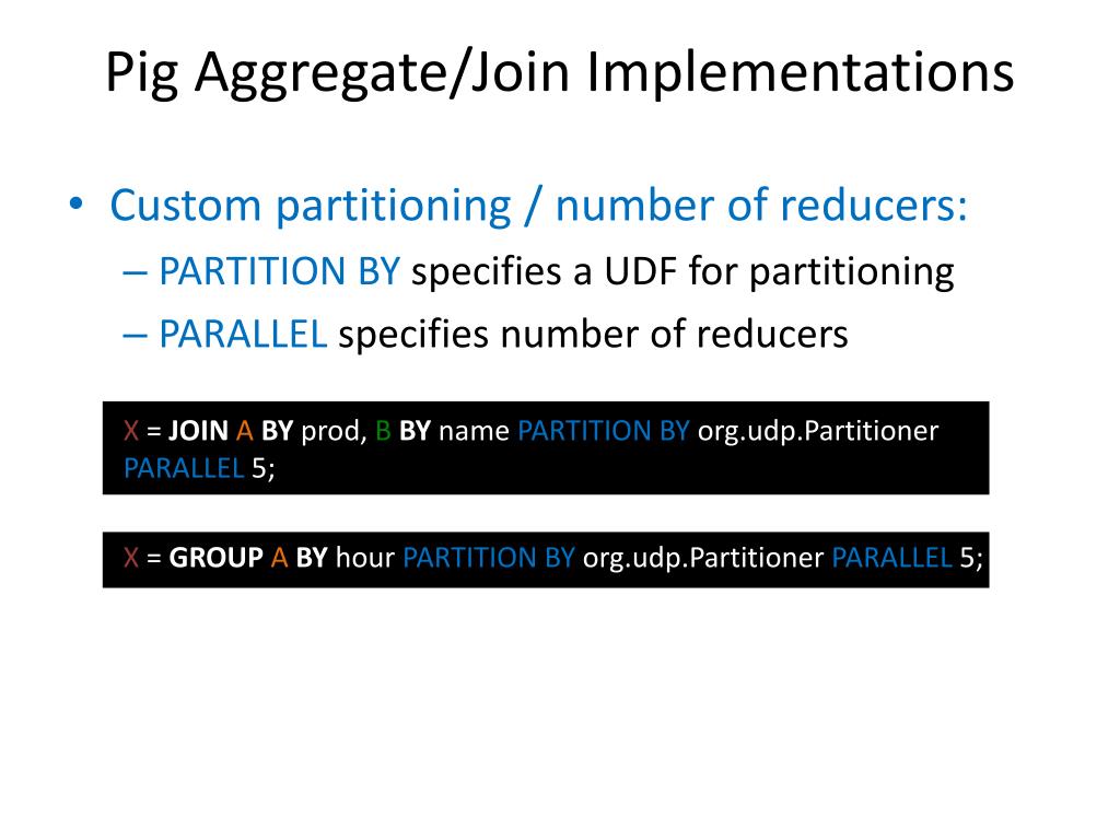 Pig Aggregate/Join Implementations • Custom partitioning / number of reducers: • PARTITION BY specifies a UDF for partitioning • PARALLEL specifies number of reducers X= JOINABY prod, BBYname PARTITION BYorg.udp.PartitionerPARALLEL5; X = GROUPABYhour PARTITION BYorg.udp.PartitionerPARALLEL 5;