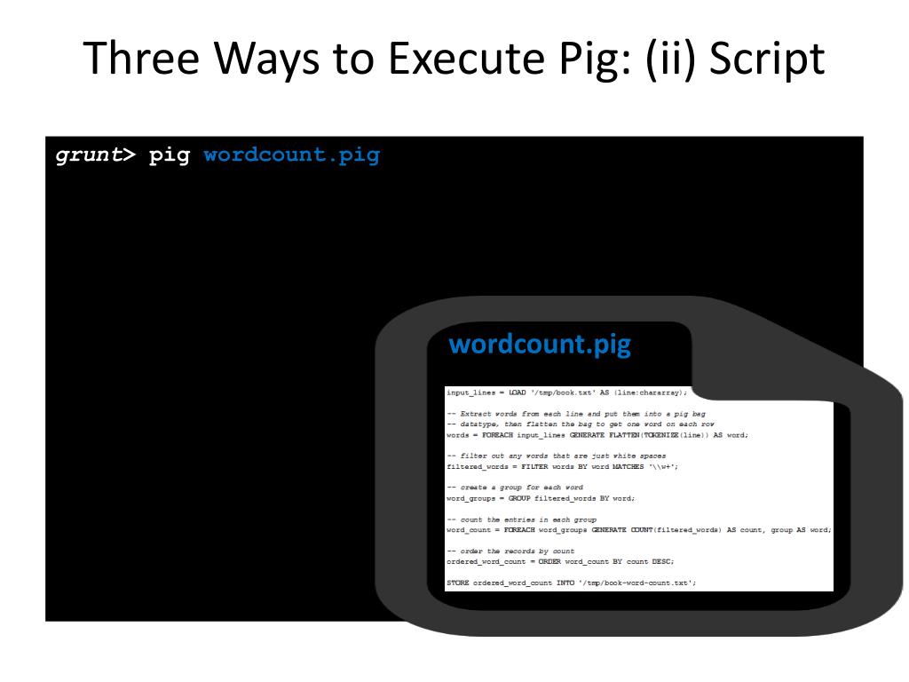 Three Ways to Execute Pig: (ii) Script grunt> pig wordcount.pig wordcount.pig