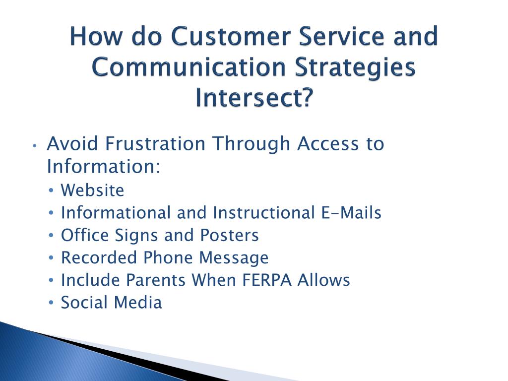 How do Customer Service and Communication Strategies Intersect? • Avoid Frustration Through Access to Information: • Website • Informational and Instructional E-Mails • Office Signs and Posters • Recorded Phone Message • Include Parents When FERPA Allows • Social Media