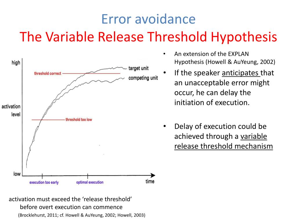 Error avoidanceThe Variable Release Threshold Hypothesis • An extension of the EXPLAN Hypothesis (Howell & AuYeung, 2002) • If the speaker anticipates that an unacceptable error might occur, he can delay the initiation of execution. • Delay of execution could be achieved through a variable release threshold mechanism • activation must exceed the ‘release threshold’ before overt execution can commence • (Brocklehurst, 2011; cf. Howell & AuYeung, 2002; Howell, 2003)