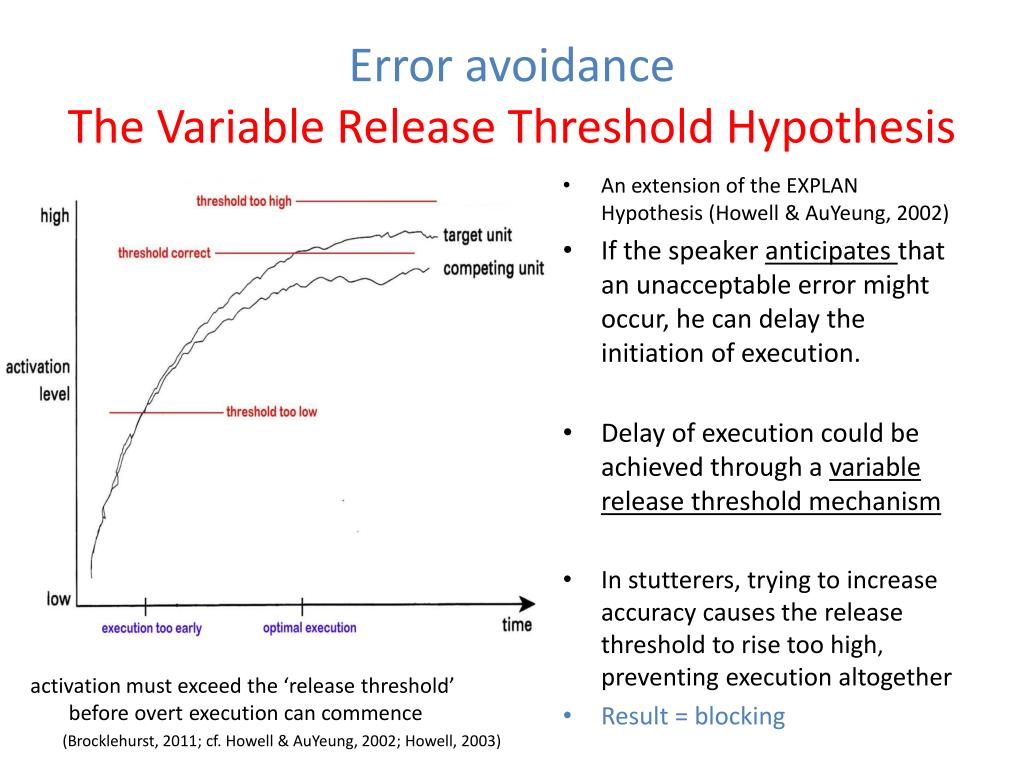 Error avoidanceThe Variable Release Threshold Hypothesis • An extension of the EXPLAN Hypothesis (Howell & AuYeung, 2002) • If the speaker anticipates that an unacceptable error might occur, he can delay the initiation of execution. • Delay of execution could be achieved through a variable release threshold mechanism • In stutterers, trying to increase accuracy causes the release threshold to rise too high, preventing execution altogether • Result = blocking • activation must exceed the ‘release threshold’ before overt execution can commence • (Brocklehurst, 2011; cf. Howell & AuYeung, 2002; Howell, 2003)