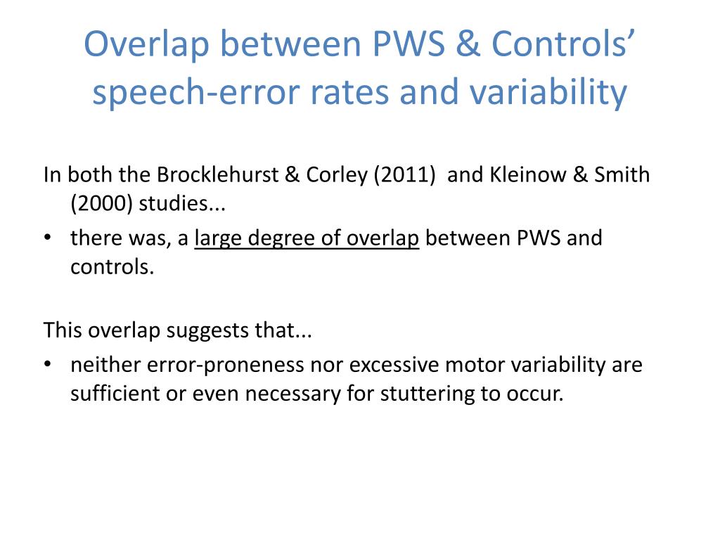 Overlap between PWS & Controls’speech-error rates and variability In both the Brocklehurst & Corley (2011) and Kleinow & Smith (2000) studies... • there was, a large degree of overlap between PWS and controls. This overlap suggests that... • neither error-proneness nor excessive motor variability are sufficient or even necessary for stuttering to occur.