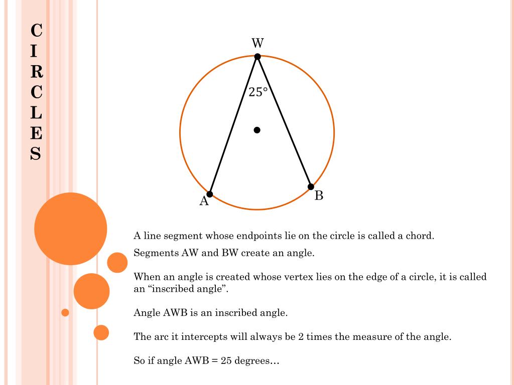 C I R CL E S W B A A line segment whose endpoints lie on the circle is called a chord. Segments AW and BW create an angle. When an angle is created whose vertex lies on the edge of a circle, it is called an “inscribed angle”.