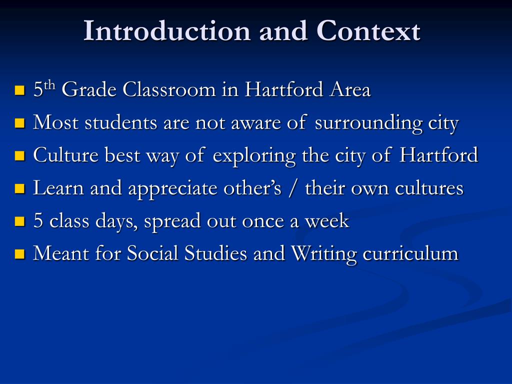 Introduction and Context • 5th Grade Classroom in Hartford Area • Most students are not aware of surrounding city • Culture best way of exploring the city of Hartford • Learn and appreciate other’s / their own cultures • 5 class days, spread out once a week • Meant for Social Studies and Writing curriculum