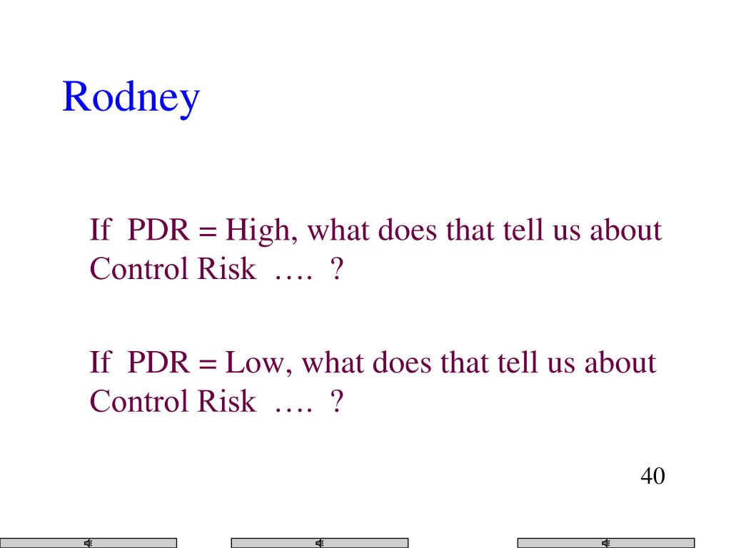 Rodney If PDR = High, what does that tell us about Control Risk …. ? If PDR = Low, what does that tell us about Control Risk …. ?