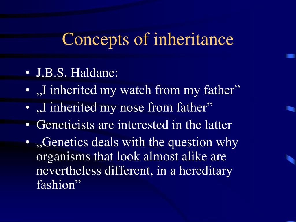 Concepts of inheritance • J.B.S. Haldane: • „I inherited my watch from my father” • „I inherited my nose from father” • Geneticists are interested in the latter • „Genetics deals with the question why organisms that look almost alike are nevertheless different, in a hereditary fashion”