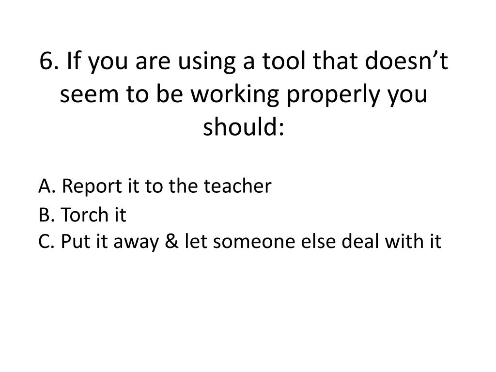 6. If you are using a tool that doesn’t seem to be working properly you should: A. Report it to the teacher B. Torch it C. Put it away & let someone else deal with it