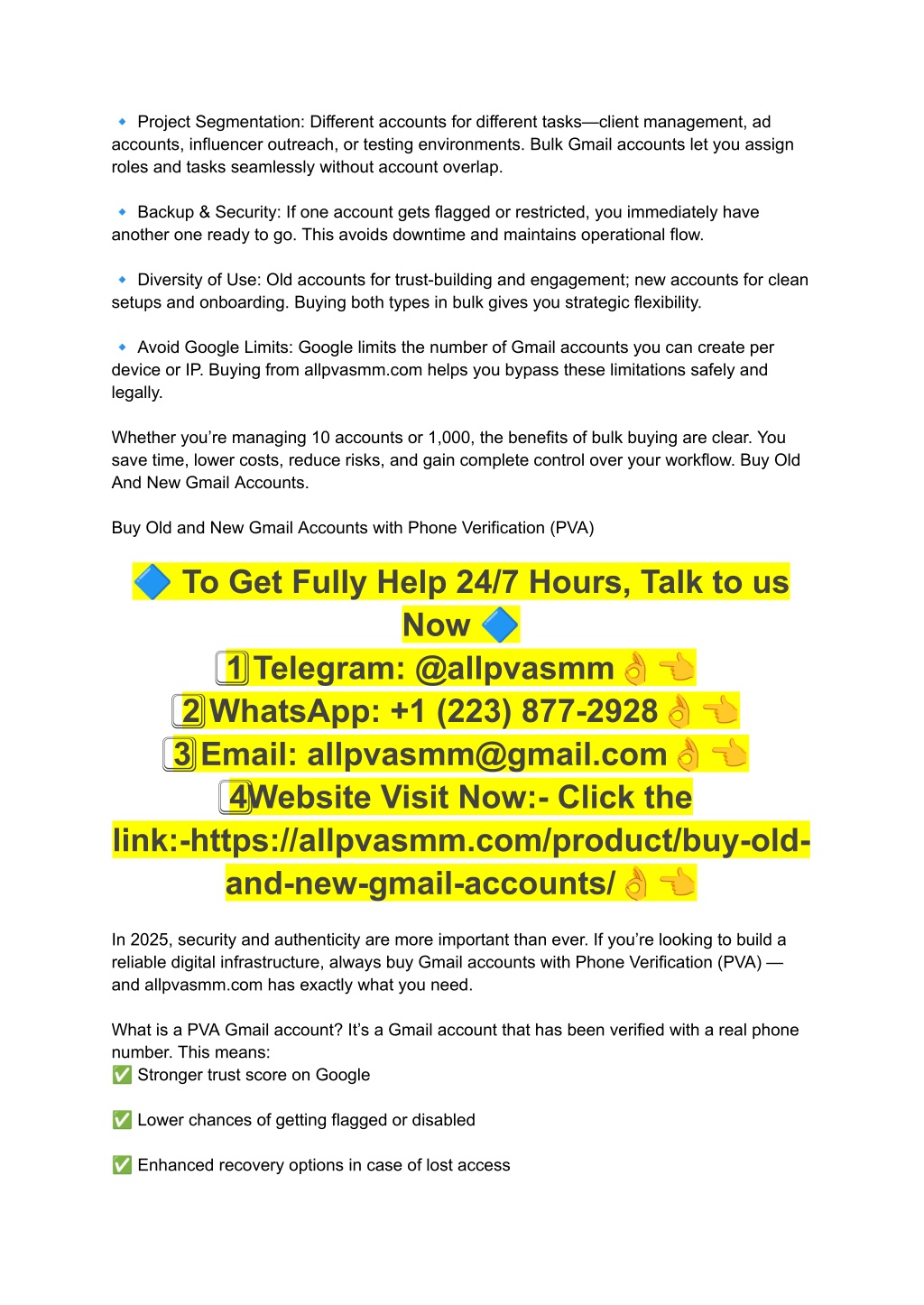 4. ? Project Segmentation: Different accounts for different tasks—client management, ad accounts, influencer outreach, or testing environments. Bulk Gmail accounts let you assign roles and tasks seamlessly without account overlap. ? Backup & Security: If one account gets flagged or restricted, you immediately have another one ready to go. This avoids downtime and maintains operational flow. ? Diversity of Use: Old accounts for trust-building and engagement; new accounts for clean setups and onboarding. Buying both types in bulk gives you strategic flexibility. ? Avoid Google Limits: Google limits the number of Gmail accounts you can create per device or IP. Buying from allpvasmm.com helps you bypass these limitations safely and legally. Whether you’re managing 10 accounts or 1,000, the benefits of bulk buying are clear. You save time, lower costs, reduce risks, and gain complete control over your workflow. Buy Old And New Gmail Accounts. Buy Old and New Gmail Accounts with Phone Verification (PVA) ? To Get Fully Help 24/7 Hours, Talk to us Now ? 1⃣ Telegram: @allpvasmm?? 2⃣ WhatsApp: +1 (223) 877-2928?? 3⃣ Email: allpvasmm@gmail.com?? 4⃣Website Visit Now:- Click the link:-https://allpvasmm.com/product/buy-old- and-new-gmail-accounts/?? In 2025, security and authenticity are more important than ever. If you’re looking to build a reliable digital infrastructure, always buy Gmail accounts with Phone Verification (PVA) — and allpvasmm.com has exactly what you need. What is a PVA Gmail account? It’s a Gmail account that has been verified with a real phone number. This means: ✅ Stronger trust score on Google ✅ Lower chances of getting flagged or disabled ✅ Enhanced recovery options in case of lost access