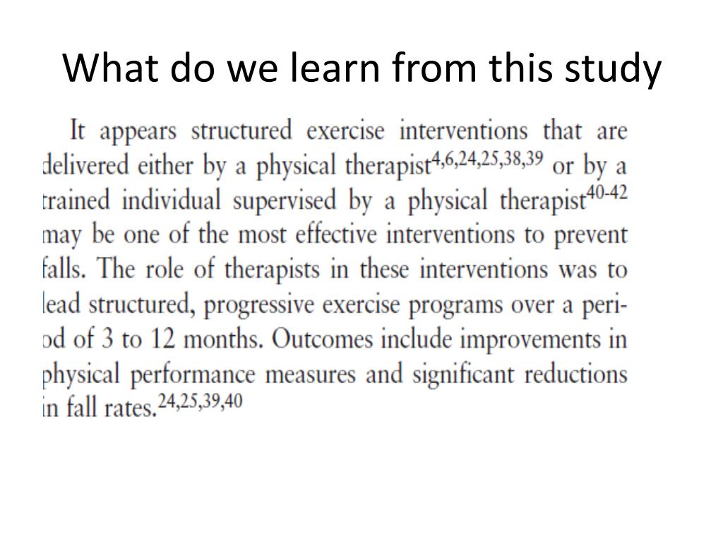 History of fall prevention • Most common interventions: • Moderate to high intensity Balance exercise training • Exercise + multifactorial interventions. • Q: What is the minimum dose of exercise to prevent falls? • A: 50 Hrs of exercise