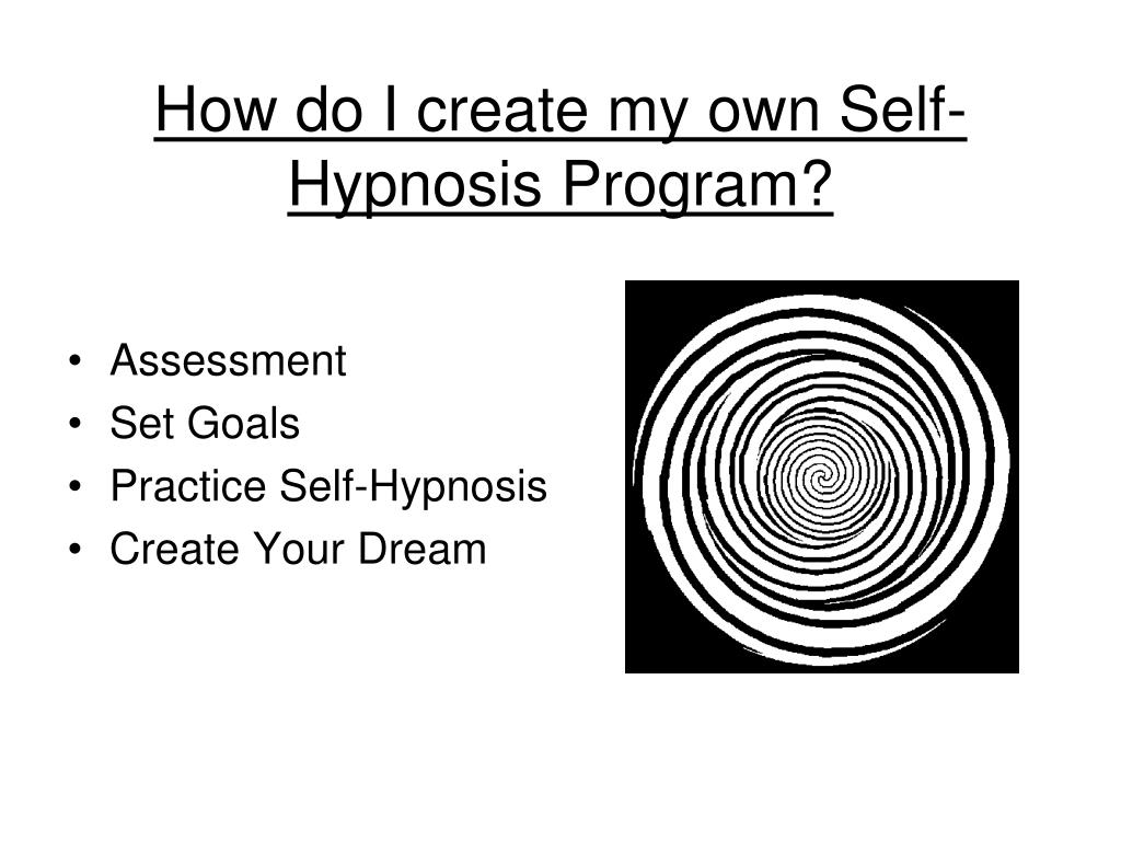 How do I create my own Self-Hypnosis Program? • Assessment • Set Goals • Practice Self-Hypnosis • Create Your Dream