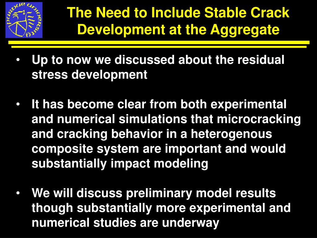 The Need to Include Stable Crack Development at the Aggregate • Up to now we discussed about the residual stress development • It has become clear from both experimental and numerical simulations that microcracking and cracking behavior in a heterogenous composite system are important and would substantially impact modeling • We will discuss preliminary model results though substantially more experimental and numerical studies are underway