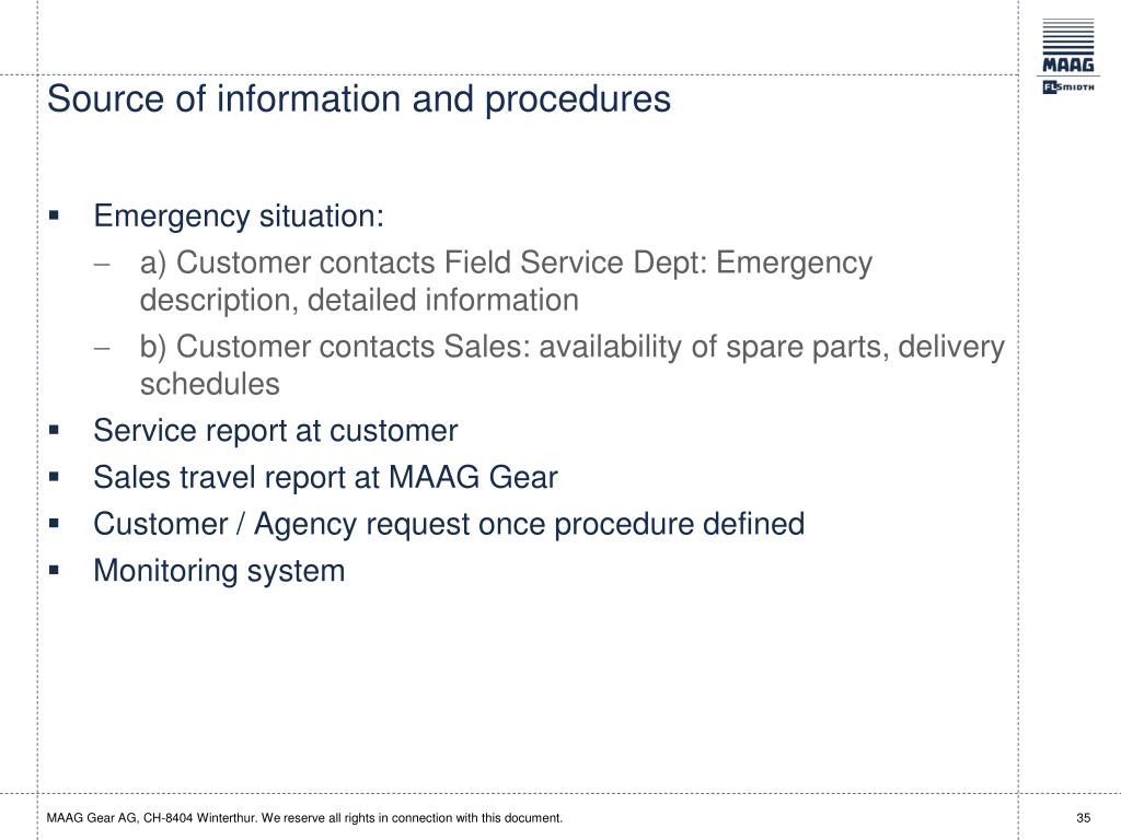 Source of information and procedures • Emergency situation: • a) Customer contacts Field Service Dept: Emergency description, detailed information • b) Customer contacts Sales: availability of spare parts, delivery schedules • Service report at customer • Sales travel report at MAAG Gear • Customer / Agency request once procedure defined • Monitoring system MAAG Gear AG, CH-8404 Winterthur. We reserve all rights in connection with this document.