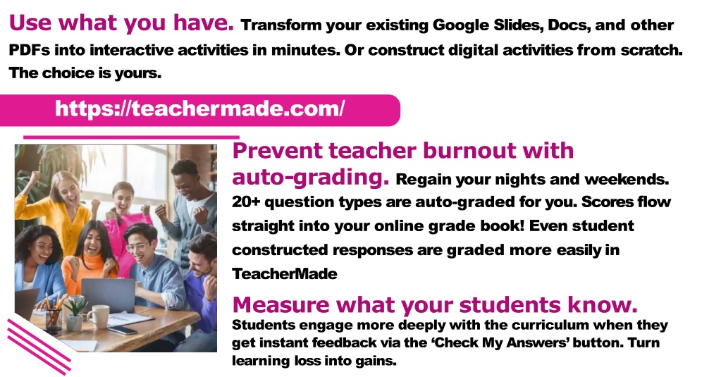 Use what you have. Transform your existing Google Slides, Docs, and other PDFsintointeractiveactivitiesinminutes.Orconstructdigitalactivitiesfromscratch. Thechoiceisyours. https://teachermade.com/ Preventteacherburnoutwith auto-grading.Regainyournightsandweekends. 20+questiontypesareauto-gradedforyou.Scoresflow straight into your online grade book! Even student constructed responses are graded more easily in TeacherMade Measurewhatyourstudentsknow. Studentsengagemoredeeplywiththecurriculumwhenthey getinstantfeedbackviathe‘CheckMyAnswers’button.Turn learninglossintogains.