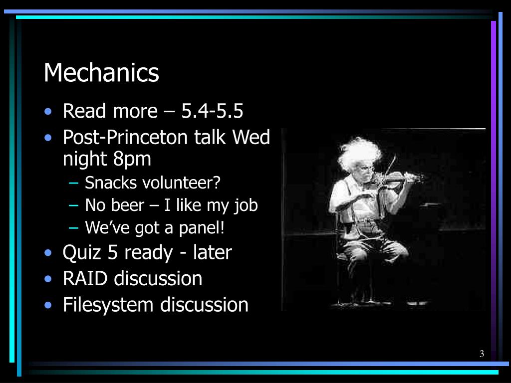 Mechanics • Read more – 5.4-5.5 • Post-Princeton talk Wed night 8pm • Snacks volunteer? • No beer – I like my job • We’ve got a panel! • Quiz 5 ready - later • RAID discussion • Filesystem discussion
