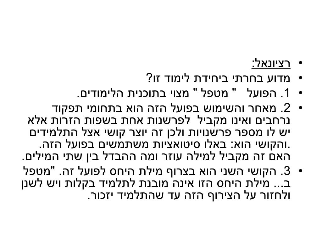 רציונאל: • מדוע בחרתי ביחידת לימוד זו? • 1. הפועל " מטפל " מצוי בתוכנית הלימודים. • 2. מאחר והשימוש בפועל הזה הוא בתחומי תפקוד נרחבים ואינו מקביל לפרשנות אחת בשפות הזרות אלא יש לו מספר פרשנויות ולכן זה יוצר קושי אצל התלמידים .והקושי הוא: באלו סיטואציות משתמשים בפועל הזה. האם זה מקביל למילה עוזר ומה ההבדל בין שתי המילים. • 3. הקושי השני הוא בצרוף מילת היחס לפועל זה. "מטפל ב... מילת היחס הזו אינה מובנת לתלמיד בקלות ויש לשנן ולחזור על הצירוף הזה עד שהתלמיד יזכור.