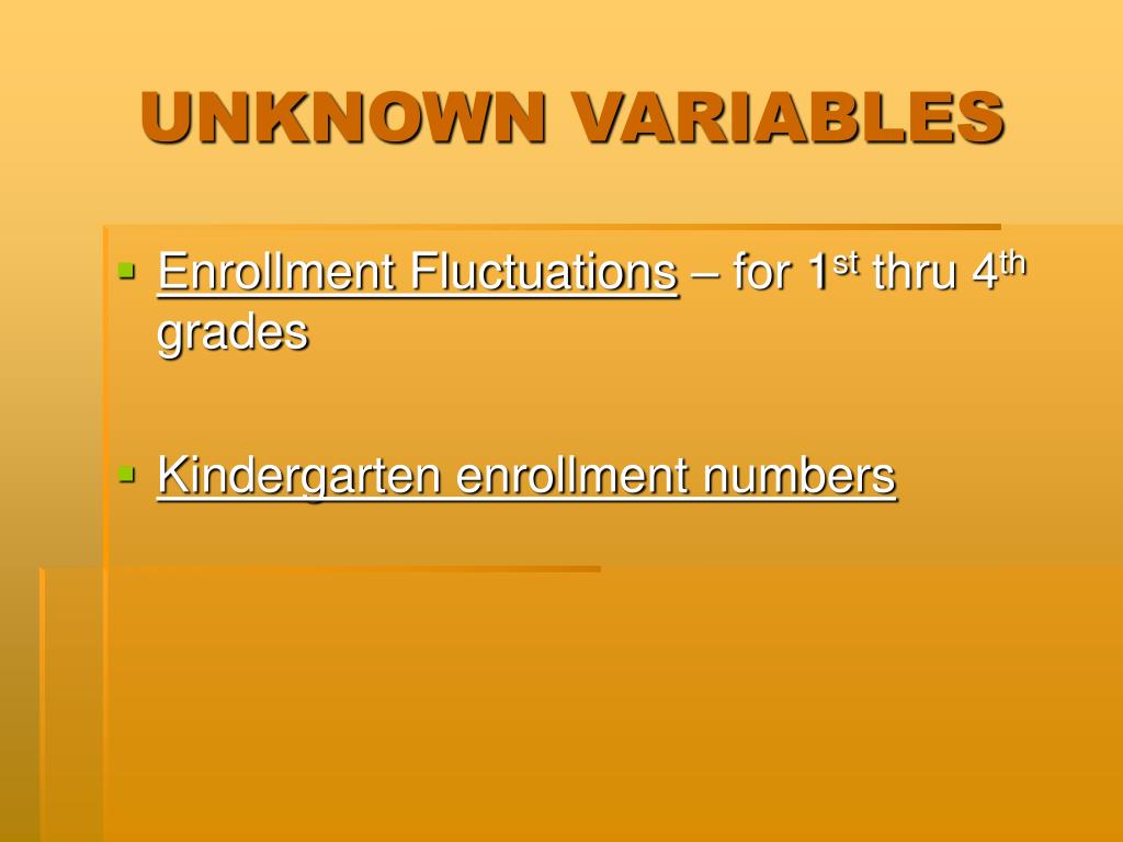 UNKNOWN VARIABLES • Enrollment Fluctuations – for 1st thru 4th grades • Kindergarten enrollment numbers