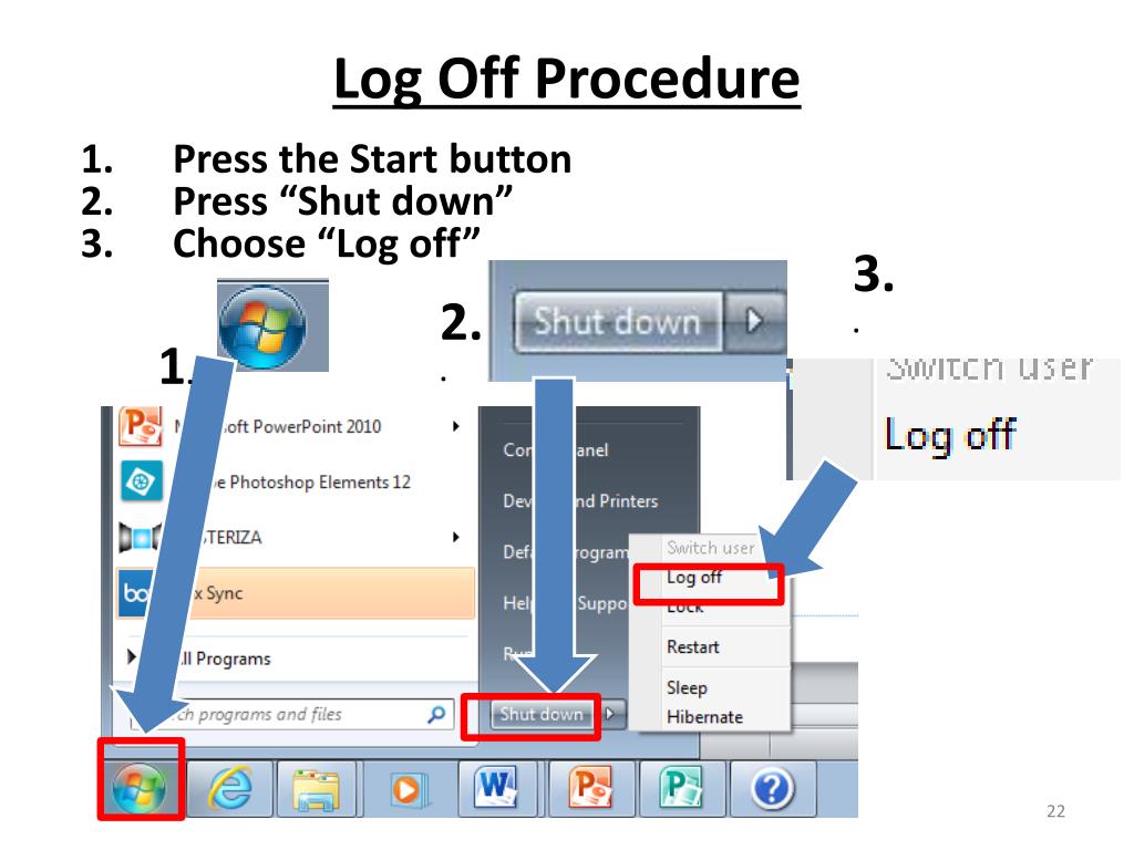 Log Off Procedure Press the Start button Press “Shut down” Choose “Log off” 3.. 2.. 1.