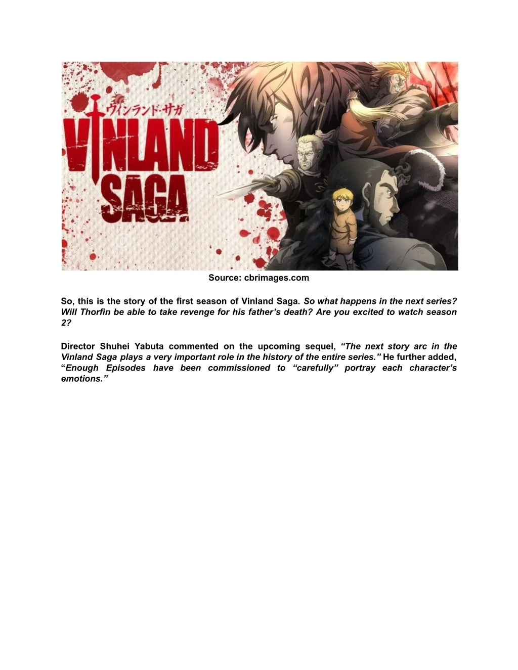 Source: cbrimages.com So, this is the story of the first season of Vinland Saga. So what happens in the next series? Will Thorfin be able to take revenge for his father’s death? Are you excited to watch season 2? Director Shuhei Yabuta commented on the upcoming sequel, “The next story arc in the Vinland Saga plays a very important role in the history of the entire series.” He further added, “Enough Episodes have been commissioned to “carefully” portray each character’s emotions.”