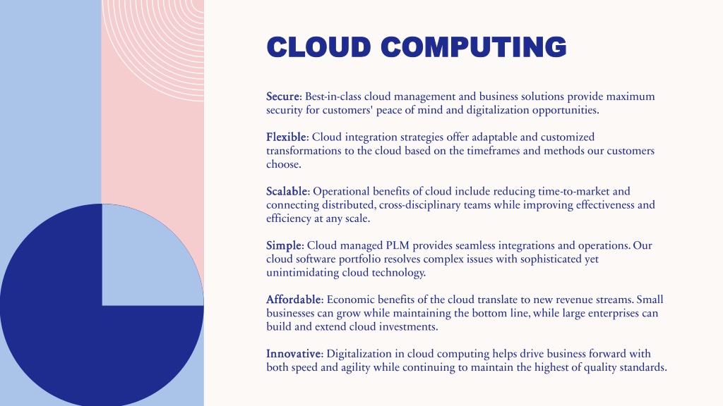 Secure: Best-in-class cloud management and business solutions provide maximum security for customers' peace of mind and digitalization opportunities. Flexible: Cloud integration strategies offer adaptable and customized transformations to the cloud based on the timeframes and methods our customers choose. Scalable: Operational benefits of cloud include reducing time-to-market and connecting distributed, cross-disciplinary teams while improving effectiveness and efficiency at any scale. Simple: Cloud managed PLM provides seamless integrations and operations. Our cloud software portfolio resolves complex issues with sophisticated yet unintimidating cloud technology. Affordable: Economic benefits of the cloud translate to new revenue streams. Small businesses can grow while maintaining the bottom line, while large enterprises can build and extend cloud investments. Innovative: Digitalization in cloud computing helps drive business forward with both speed and agility while continuing to maintain the highest of quality standards. Cloud Computing