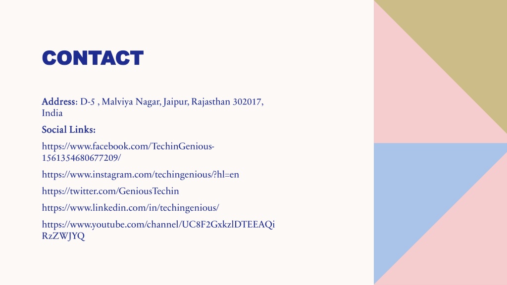 Contact Address: D-5 , Malviya Nagar, Jaipur, Rajasthan 302017, India Social Links: https://www.facebook.com/TechinGenious-1561354680677209/ https://www.instagram.com/techingenious/?hl=en https://twitter.com/GeniousTechin https://www.linkedin.com/in/techingenious/ https://www.youtube.com/channel/UC8F2GxkzlDTEEAQiRzZWJYQ