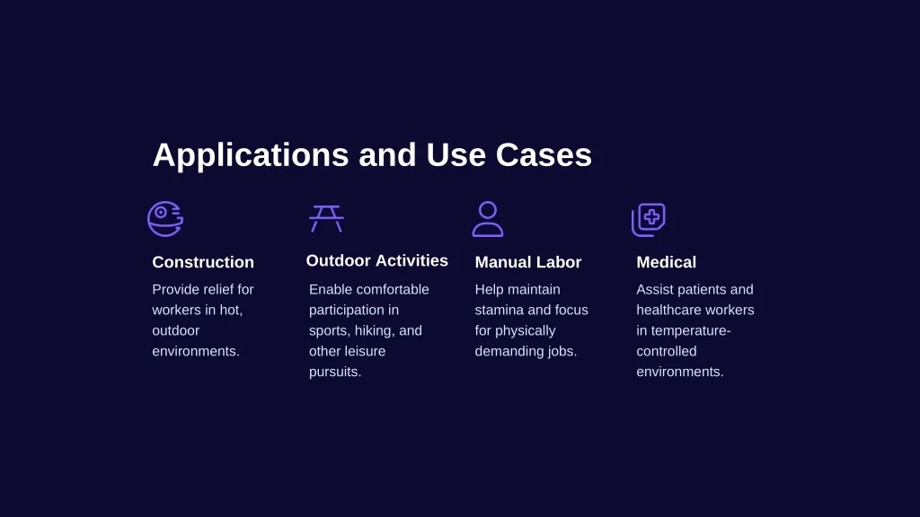 Applications and Use Cases Outdoor Activities Construction Manual Labor Medical Provide relief for workers in hot, outdoor environments. Enable comfortable participation in sports, hiking, and other leisure pursuits. Help maintain stamina and focus for physically demanding jobs. Assist patients and healthcare workers in temperature- controlled environments.