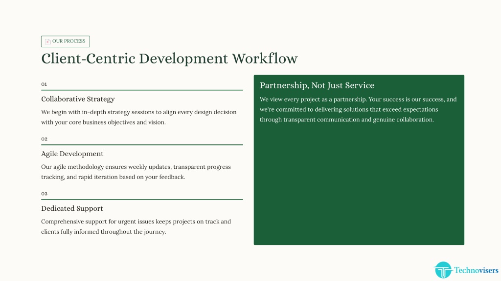 OUR PROCESS Client-Centric Development Workflow Partnership, Not Just Service 01 Collaborative Strategy We view every project as a partnership. Your success is our success, and we're committed to delivering solutions that exceed expectations through transparent communication and genuine collaboration. We begin with in-depth strategy sessions to align every design decision with your core business objectives and vision. 02 Agile Development Our agile methodology ensures weekly updates, transparent progress tracking, and rapid iteration based on your feedback. 03 Dedicated Support Comprehensive support for urgent issues keeps projects on track and clients fully informed throughout the journey.
