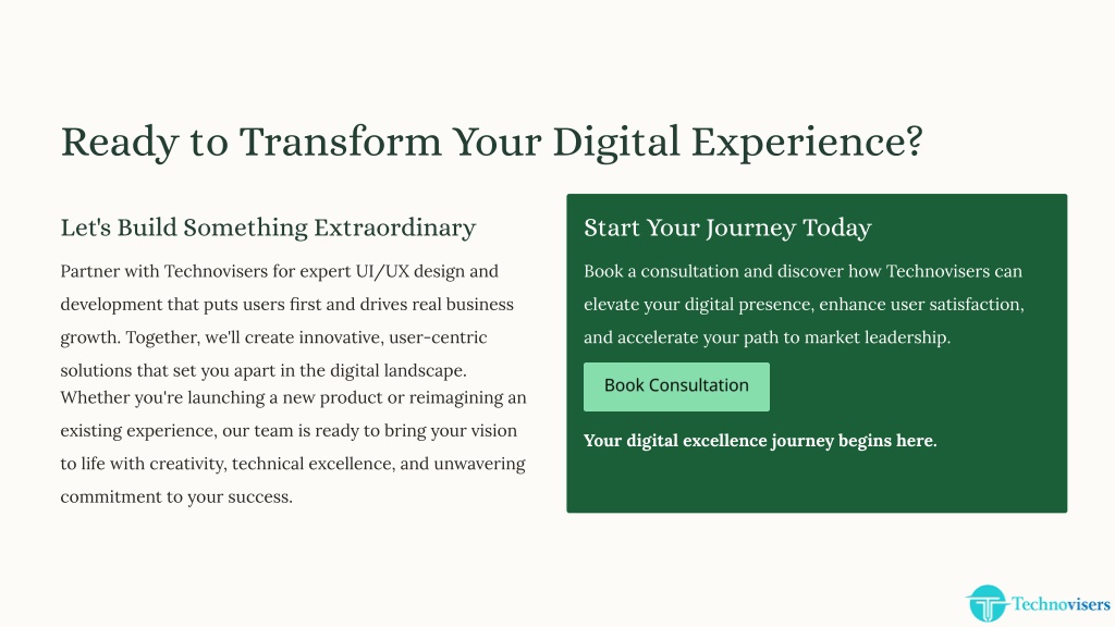 Ready to Transform Your Digital Experience? Let's Build Something Extraordinary Start Your Journey Today Partner with Technovisers for expert UI/UX design and Book a consultation and discover how Technovisers can development that puts users first and drives real business elevate your digital presence, enhance user satisfaction, growth. Together, we'll create innovative, user-centric and accelerate your path to market leadership. solutions that set you apart in the digital landscape. Whether you're launching a new product or reimagining an existing experience, our team is ready to bring your vision Your digital excellence journey begins here. to life with creativity, technical excellence, and unwavering commitment to your success.