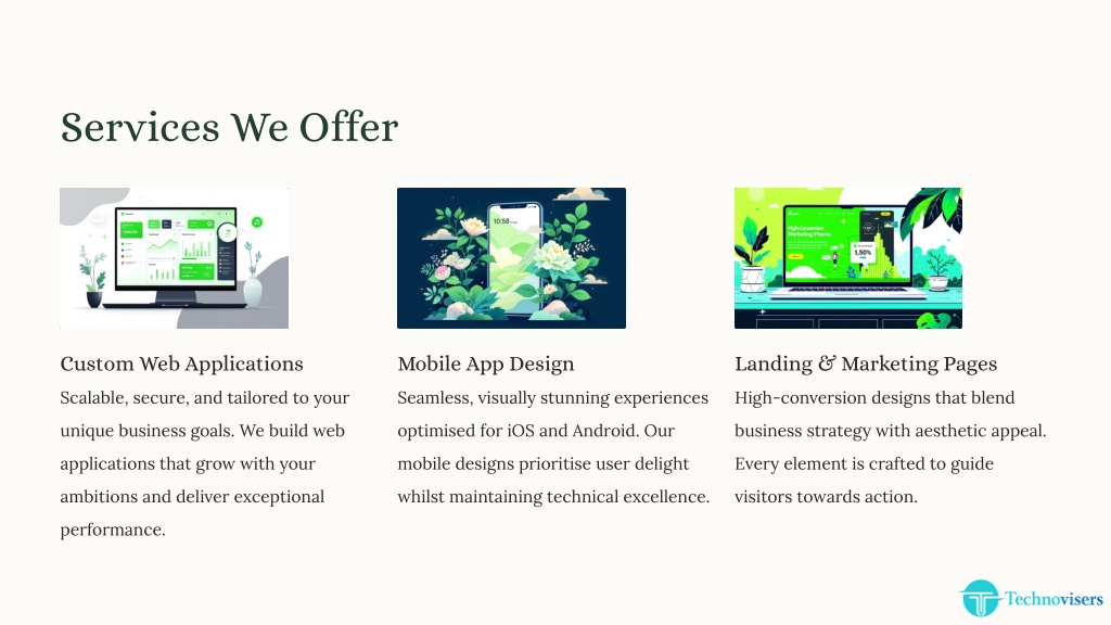 Services We Offer Custom Web Applications Mobile App Design Landing & Marketing Pages Scalable, secure, and tailored to your Seamless, visually stunning experiences High-conversion designs that blend unique business goals. We build web optimised for iOS and Android. Our business strategy with aesthetic appeal. applications that grow with your mobile designs prioritise user delight Every element is crafted to guide ambitions and deliver exceptional whilst maintaining technical excellence. visitors towards action. performance.