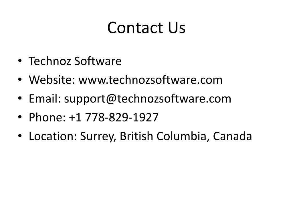 15. Contact Us • Technoz Software • Website: www.technozsoftware.com • Email: support@technozsoftware.com • Phone: +1 778-829-1927 • Location: Surrey, British Columbia, Canada