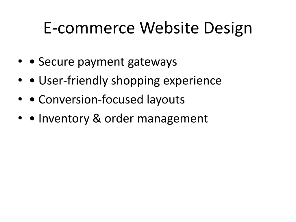 8. E-commerce Website Design • • Secure payment gateways • • User-friendly shopping experience • • Conversion-focused layouts • • Inventory & order management