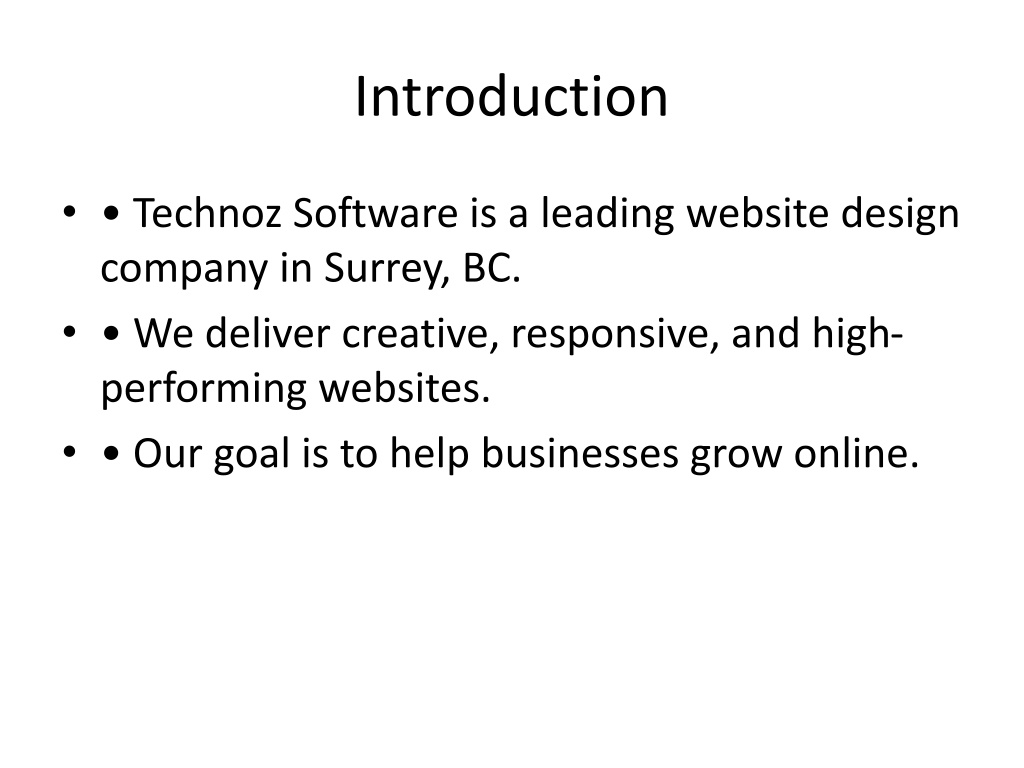2. Introduction • • Technoz Software is a leading website design company in Surrey, BC. • • We deliver creative, responsive, and high-performing websites. • • Our goal is to help businesses grow online.