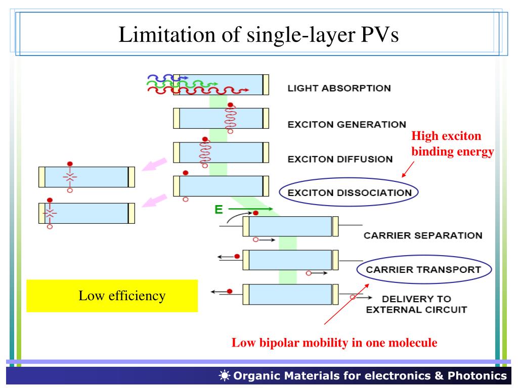 Low efficiency Limitation of single-layer PVs High exciton binding energy Low bipolar mobility in one molecule Organic Materials for electronics & Photonics