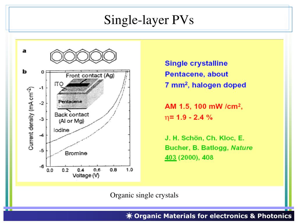 Single-layer PVs Organic single crystals Organic Materials for electronics & Photonics