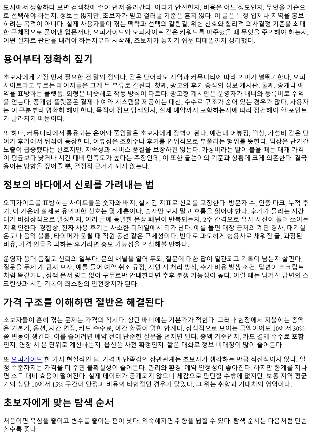 도시에서생활하다보면검색창에손이먼저올라간다. 어디가안전한지, 비용은어느정도인지, 무엇을기준으 로선택해야하는지. 정보는많지만, 초보자가믿고걸러낼기준은흔치않다. 이글은특정업체나지역을홍보 하려는목적이아니다. 실제사용자들이겪는맥락과선택의갈림길, 위험신호와합리적의사결정기준을최대 한구체적으로풀어낸입문서다. 오피가이드와오피사이트같은키워드를마주했을때무엇을주의해야하는지, 어떤절차로판단을내려야하는지부터시작해, 초보자가놓치기쉬운디테일까지정리했다. 용어부터정확히짚기 초보자에게가장먼저필요한건말의정의다. 같은단어라도지역과커뮤니티에따라의미가널뛰기한다. 오피 사이트라고부르는페이지들은크게두부류로갈린다. 첫째, 광고와후기중심의정보게시판. 둘째, 중개나예 약을표방하는플랫폼. 외형은비슷해도작동방식이다르다. 광고형게시판은운영자가배너와등록비로수익 을얻는다. 중개형플랫폼은결제나예약시스템을제공하는대신, 수수료구조가숨어있는경우가많다. 사용자 는이구분부터명확히해야한다. 목적이정보탐색인지, 실제예약까지포함하는지에따라점검해야할포인트 가달라지기때문이다. 또하나, 커뮤니티에서통용되는은어와줄임말은초보자에게장벽이된다. 예컨대어뷰징, 떡상, 가성비같은단 어가후기에서뒤섞여등장한다. 어뷰징은조회수나후기를인위적으로부풀리는행위를뜻한다. 떡상은단기간 노출이급증했다는신호지만, 지속성과서비스품질을보장하진않는다. 가성비라는말이붙을때는대개가격 이평균보다낮거나시간대비만족도가높다는주장인데, 이또한글쓴이의기준과상황에크게의존한다. 결국 용어는방향을짚어줄뿐, 결정적근거가되지않는다. 정보의바다에서신뢰를가려내는법 오피가이드를표방하는사이트들은숫자와배지, 실시간지표로신뢰를포장한다. 방문자수, 인증마크, 누적후 기. 이가운데실제로유의미한신호는몇개뿐이다. 숫자만보지말고흐름을읽어야한다. 후기가몰리는시간 대가비정상적으로일정한지, 여러글에동일한문장패턴이반복되는지, 2주간격으로유사사진이돌려쓰이는 지확인한다. 경험상, 진짜사용후기는사소한디테일에서티가난다. 예를들면매장근처의계단경사, 대기실 온도나음악볼륨, 타이머가울릴때직원동선같은구체성이다. 반대로과도하게형용사로채워진글, 과장된 비유, 가격언급을피하는후기라면홍보가능성을의심해볼만하다. 운영자응대품질도신뢰의일부다. 문의채널을열어두되, 질문에대한답이일관되고기록이남는지살핀다. 질문을두세개던져보자. 예를들어예약취소규정, 지연시처리방식, 추가비용발생조건. 답변이스크립트 처럼똑같거나, 정책문서링크없이구두로만안내한다면추후분쟁가능성이높다. 이럴때는남겨진답변의스 크린샷과시간기록이최소한의안전장치가된다. 가격구조를이해하면절반은해결된다 초보자들이흔히겪는문제는가격의착시다. 상단배너에는기본가가적힌다. 그러나현장에서지불하는총액 은기본가, 옵션, 시간연장, 카드수수료, 야간할증이얽힌합계다. 상식적으로보이는금액이어도 10에서 30% 쯤변동이생긴다. 이를줄이려면예약전에단순한질문을던지면된다. 총액기준인지, 카드결제수수료포함 인지, 연장시분단위로계산하는지, 옵션은사전확정인지. 짧은대화로정보비대칭이많이줄어든다. 또오피가이드한가지현실적인팁. 가격과만족감의상관관계는초보자가생각하는만큼직선적이지않다. 일 정수준까지는가격을더주면불확실성이줄어든다. 관리와환경, 예약안정성이좋아진다. 하지만한계를지나 면소득대비효용이떨어진다. 실제데이터가공개되지않으니체감으로판단할수밖에없지만, 보통지역평균 가의상단 10에서 15% 구간이안정과비용의타협점인경우가많았다. 그위는취향과기대치의영역이다. 초보자에게맞는탐색순서 처음이면욕심을줄이고변수를줄이는편이낫다. 익숙해지면취향을넓힐수있다. 탐색순서는다음처럼단순 할수록좋다.