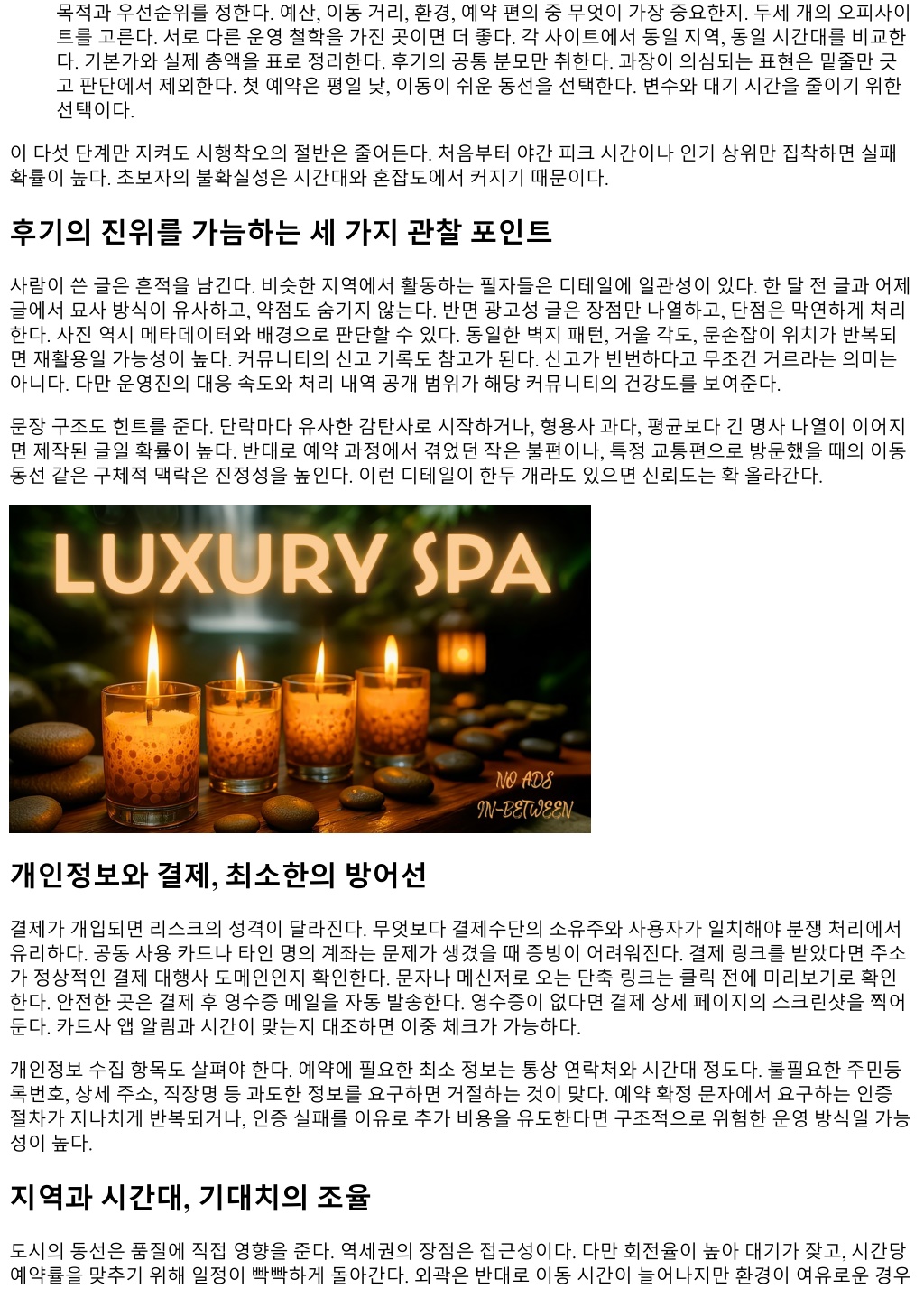 목적과우선순위를정한다. 예산, 이동거리, 환경, 예약편의중무엇이가장중요한지. 두세개의오피사이 트를고른다. 서로다른운영철학을가진곳이면더좋다. 각사이트에서동일지역, 동일시간대를비교한 다. 기본가와실제총액을표로정리한다. 후기의공통분모만취한다. 과장이의심되는표현은밑줄만긋 고판단에서제외한다. 첫예약은평일낮, 이동이쉬운동선을선택한다. 변수와대기시간을줄이기위한 선택이다. 이다섯단계만지켜도시행착오의절반은줄어든다. 처음부터야간피크시간이나인기상위만집착하면실패 확률이높다. 초보자의불확실성은시간대와혼잡도에서커지기때문이다. 후기의진위를가늠하는세가지관찰포인트 사람이쓴글은흔적을남긴다. 비슷한지역에서활동하는필자들은디테일에일관성이있다. 한달전글과어제 글에서묘사방식이유사하고, 약점도숨기지않는다. 반면광고성글은장점만나열하고, 단점은막연하게처리 한다. 사진역시메타데이터와배경으로판단할수있다. 동일한벽지패턴, 거울각도, 문손잡이위치가반복되 면재활용일가능성이높다. 커뮤니티의신고기록도참고가된다. 신고가빈번하다고무조건거르라는의미는 아니다. 다만운영진의대응속도와처리내역공개범위가해당커뮤니티의건강도를보여준다. 문장구조도힌트를준다. 단락마다유사한감탄사로시작하거나, 형용사과다, 평균보다긴명사나열이이어지 면제작된글일확률이높다. 반대로예약과정에서겪었던작은불편이나, 특정교통편으로방문했을때의이동 동선같은구체적맥락은진정성을높인다. 이런디테일이한두개라도있으면신뢰도는확올라간다. 개인정보와결제, 최소한의방어선 결제가개입되면리스크의성격이달라진다. 무엇보다결제수단의소유주와사용자가일치해야분쟁처리에서 유리하다. 공동사용카드나타인명의계좌는문제가생겼을때증빙이어려워진다. 결제링크를받았다면주소 가정상적인결제대행사도메인인지확인한다. 문자나메신저로오는단축링크는클릭전에미리보기로확인 한다. 안전한곳은결제후영수증메일을자동발송한다. 영수증이없다면결제상세페이지의스크린샷을찍어 둔다. 카드사앱알림과시간이맞는지대조하면이중체크가가능하다. 개인정보수집항목도살펴야한다. 예약에필요한최소정보는통상연락처와시간대정도다. 불필요한주민등 록번호, 상세주소, 직장명등과도한정보를요구하면거절하는것이맞다. 예약확정문자에서요구하는인증 절차가지나치게반복되거나, 인증실패를이유로추가비용을유도한다면구조적으로위험한운영방식일가능 성이높다. 지역과시간대, 기대치의조율 도시의동선은품질에직접영향을준다. 역세권의장점은접근성이다. 다만회전율이높아대기가잦고, 시간당 예약률을맞추기위해일정이빡빡하게돌아간다. 외곽은반대로이동시간이늘어나지만환경이여유로운경우