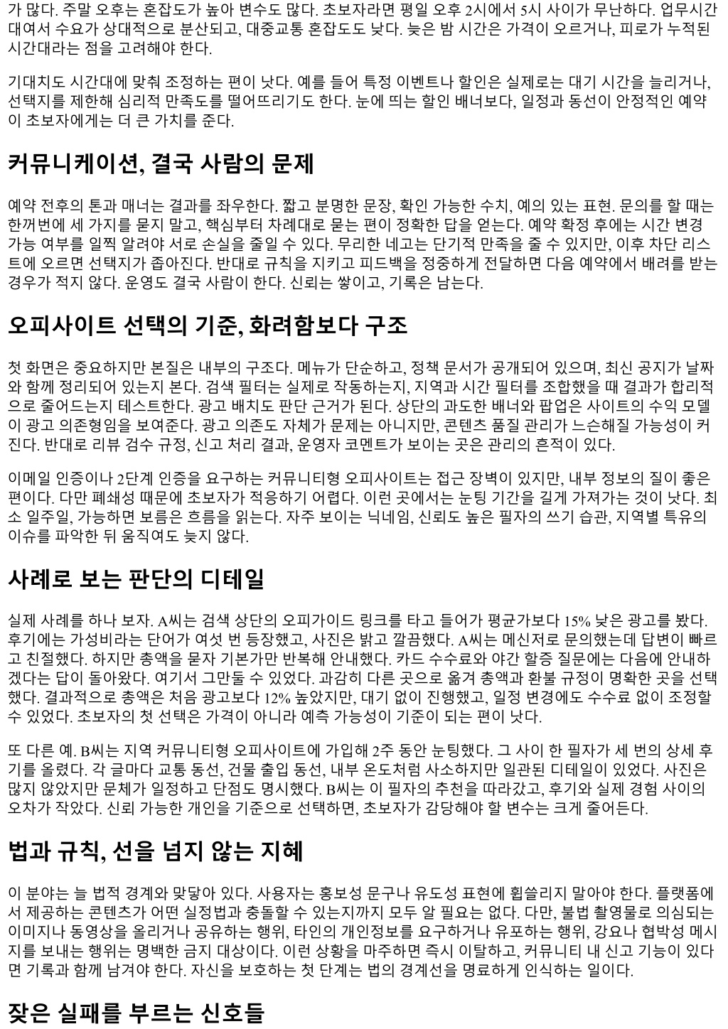 가많다. 주말오후는혼잡도가높아변수도많다. 초보자라면평일오후 2시에서 5시사이가무난하다. 업무시간 대여서수요가상대적으로분산되고, 대중교통혼잡도도낮다. 늦은밤시간은가격이오르거나, 피로가누적된 시간대라는점을고려해야한다. 기대치도시간대에맞춰조정하는편이낫다. 예를들어특정이벤트나할인은실제로는대기시간을늘리거나, 선택지를제한해심리적만족도를떨어뜨리기도한다. 눈에띄는할인배너보다, 일정과동선이안정적인예약 이초보자에게는더큰가치를준다. 커뮤니케이션, 결국사람의문제 예약전후의톤과매너는결과를좌우한다. 짧고분명한문장, 확인가능한수치, 예의있는표현. 문의를할때는 한꺼번에세가지를묻지말고, 핵심부터차례대로묻는편이정확한답을얻는다. 예약확정후에는시간변경 가능여부를일찍알려야서로손실을줄일수있다. 무리한네고는단기적만족을줄수있지만, 이후차단리스 트에오르면선택지가좁아진다. 반대로규칙을지키고피드백을정중하게전달하면다음예약에서배려를받는 경우가적지않다. 운영도결국사람이한다. 신뢰는쌓이고, 기록은남는다. 오피사이트선택의기준, 화려함보다구조 첫화면은중요하지만본질은내부의구조다. 메뉴가단순하고, 정책문서가공개되어있으며, 최신공지가날짜 와함께정리되어있는지본다. 검색필터는실제로작동하는지, 지역과시간필터를조합했을때결과가합리적 으로줄어드는지테스트한다. 광고배치도판단근거가된다. 상단의과도한배너와팝업은사이트의수익모델 이광고의존형임을보여준다. 광고의존도자체가문제는아니지만, 콘텐츠품질관리가느슨해질가능성이커 진다. 반대로리뷰검수규정, 신고처리결과, 운영자코멘트가보이는곳은관리의흔적이있다. 이메일인증이나 2단계인증을요구하는커뮤니티형오피사이트는접근장벽이있지만, 내부정보의질이좋은 편이다. 다만폐쇄성때문에초보자가적응하기어렵다. 이런곳에서는눈팅기간을길게가져가는것이낫다. 최 소일주일, 가능하면보름은흐름을읽는다. 자주보이는닉네임, 신뢰도높은필자의쓰기습관, 지역별특유의 이슈를파악한뒤움직여도늦지않다. 사례로보는판단의디테일 실제사례를하나보자. A씨는검색상단의오피가이드링크를타고들어가평균가보다 15% 낮은광고를봤다. 후기에는가성비라는단어가여섯번등장했고, 사진은밝고깔끔했다. A씨는메신저로문의했는데답변이빠르 고친절했다. 하지만총액을묻자기본가만반복해안내했다. 카드수수료와야간할증질문에는다음에안내하 겠다는답이돌아왔다. 여기서그만둘수있었다. 과감히다른곳으로옮겨총액과환불규정이명확한곳을선택 했다. 결과적으로총액은처음광고보다 12% 높았지만, 대기없이진행했고, 일정변경에도수수료없이조정할 수있었다. 초보자의첫선택은가격이아니라예측가능성이기준이되는편이낫다. 또다른예. B씨는지역커뮤니티형오피사이트에가입해 2주동안눈팅했다. 그사이한필자가세번의상세후 기를올렸다. 각글마다교통동선, 건물출입동선, 내부온도처럼사소하지만일관된디테일이있었다. 사진은 많지않았지만문체가일정하고단점도명시했다. B씨는이필자의추천을따라갔고, 후기와실제경험사이의 오차가작았다. 신뢰가능한개인을기준으로선택하면, 초보자가감당해야할변수는크게줄어든다. 법과규칙, 선을넘지않는지혜 이분야는늘법적경계와맞닿아있다. 사용자는홍보성문구나유도성표현에휩쓸리지말아야한다. 플랫폼에 서제공하는콘텐츠가어떤실정법과충돌할수있는지까지모두알필요는없다. 다만, 불법촬영물로의심되는 이미지나동영상을올리거나공유하는행위, 타인의개인정보를요구하거나유포하는행위, 강요나협박성메시 지를보내는행위는명백한금지대상이다. 이런상황을마주하면즉시이탈하고, 커뮤니티내신고기능이있다 면기록과함께남겨야한다. 자신을보호하는첫단계는법의경계선을명료하게인식하는일이다. 잦은실패를부르는신호들