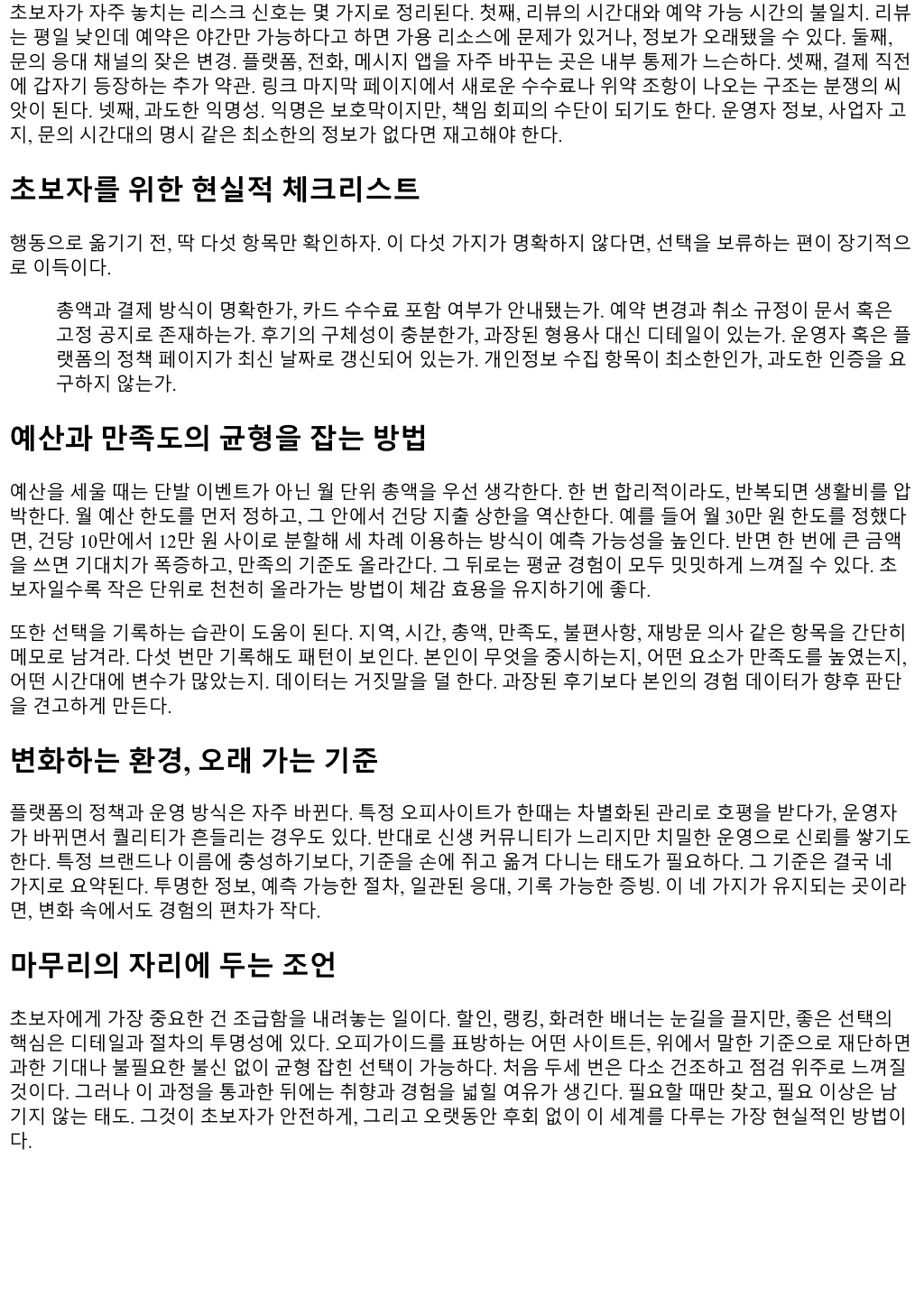 초보자가자주놓치는리스크신호는몇가지로정리된다. 첫째, 리뷰의시간대와예약가능시간의불일치. 리뷰 는평일낮인데예약은야간만가능하다고하면가용리소스에문제가있거나, 정보가오래됐을수있다. 둘째, 문의응대채널의잦은변경. 플랫폼, 전화, 메시지앱을자주바꾸는곳은내부통제가느슨하다. 셋째, 결제직전 에갑자기등장하는추가약관. 링크마지막페이지에서새로운수수료나위약조항이나오는구조는분쟁의씨 앗이된다. 넷째, 과도한익명성. 익명은보호막이지만, 책임회피의수단이되기도한다. 운영자정보, 사업자고 지, 문의시간대의명시같은최소한의정보가없다면재고해야한다. 초보자를위한현실적체크리스트 행동으로옮기기전, 딱다섯항목만확인하자. 이다섯가지가명확하지않다면, 선택을보류하는편이장기적으 로이득이다. 총액과결제방식이명확한가, 카드수수료포함여부가안내됐는가. 예약변경과취소규정이문서혹은 고정공지로존재하는가. 후기의구체성이충분한가, 과장된형용사대신디테일이있는가. 운영자혹은플 랫폼의정책페이지가최신날짜로갱신되어있는가. 개인정보수집항목이최소한인가, 과도한인증을요 구하지않는가. 예산과만족도의균형을잡는방법 예산을세울때는단발이벤트가아닌월단위총액을우선생각한다. 한번합리적이라도, 반복되면생활비를압 박한다. 월예산한도를먼저정하고, 그안에서건당지출상한을역산한다. 예를들어월 30만원한도를정했다 면, 건당 10만에서 12만원사이로분할해세차례이용하는방식이예측가능성을높인다. 반면한번에큰금액 을쓰면기대치가폭증하고, 만족의기준도올라간다. 그뒤로는평균경험이모두밋밋하게느껴질수있다. 초 보자일수록작은단위로천천히올라가는방법이체감효용을유지하기에좋다. 또한선택을기록하는습관이도움이된다. 지역, 시간, 총액, 만족도, 불편사항, 재방문의사같은항목을간단히 메모로남겨라. 다섯번만기록해도패턴이보인다. 본인이무엇을중시하는지, 어떤요소가만족도를높였는지, 어떤시간대에변수가많았는지. 데이터는거짓말을덜한다. 과장된후기보다본인의경험데이터가향후판단 을견고하게만든다. 변화하는환경, 오래가는기준 플랫폼의정책과운영방식은자주바뀐다. 특정오피사이트가한때는차별화된관리로호평을받다가, 운영자 가바뀌면서퀄리티가흔들리는경우도있다. 반대로신생커뮤니티가느리지만치밀한운영으로신뢰를쌓기도 한다. 특정브랜드나이름에충성하기보다, 기준을손에쥐고옮겨다니는태도가필요하다. 그기준은결국네 가지로요약된다. 투명한정보, 예측가능한절차, 일관된응대, 기록가능한증빙. 이네가지가유지되는곳이라 면, 변화속에서도경험의편차가작다. 마무리의자리에두는조언 초보자에게가장중요한건조급함을내려놓는일이다. 할인, 랭킹, 화려한배너는눈길을끌지만, 좋은선택의 핵심은디테일과절차의투명성에있다. 오피가이드를표방하는어떤사이트든, 위에서말한기준으로재단하면 과한기대나불필요한불신없이균형잡힌선택이가능하다. 처음두세번은다소건조하고점검위주로느껴질 것이다. 그러나이과정을통과한뒤에는취향과경험을넓힐여유가생긴다. 필요할때만찾고, 필요이상은남 기지않는태도. 그것이초보자가안전하게, 그리고오랫동안후회없이이세계를다루는가장현실적인방법이 다.